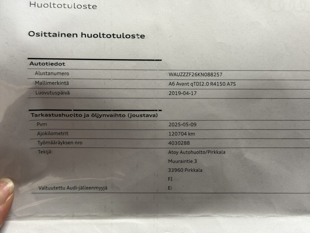 - Viimeisin huolto tehty 120 tkm 5/2025