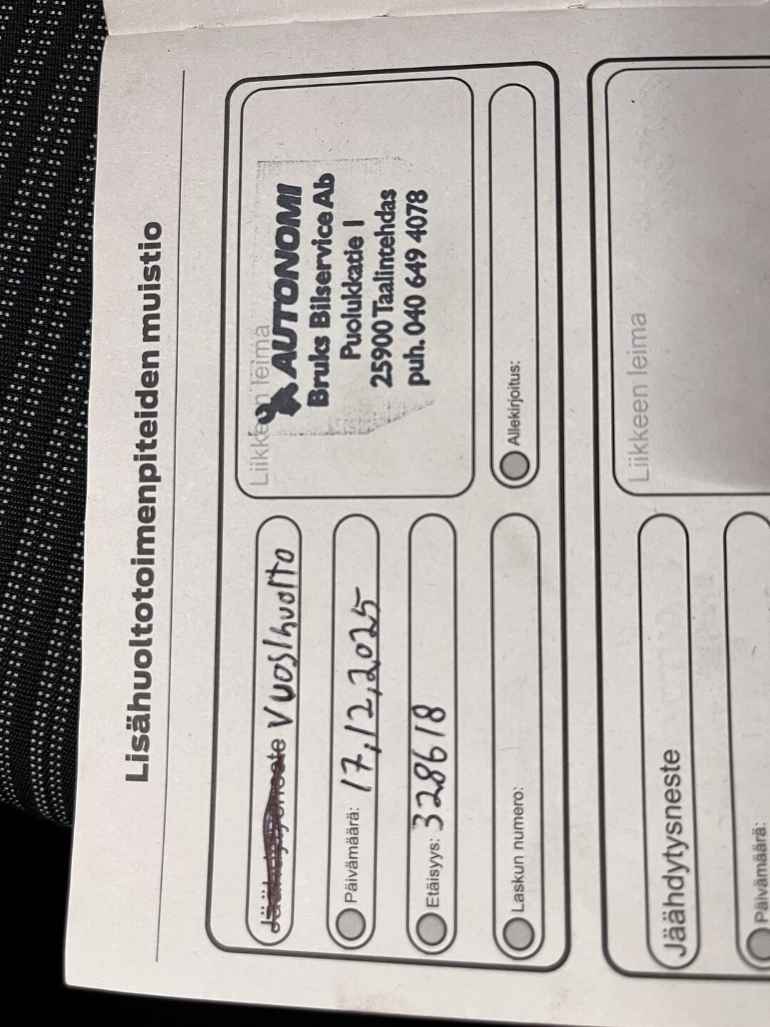 - Viimeisin huolto tehty 328 tkm 12/2025
