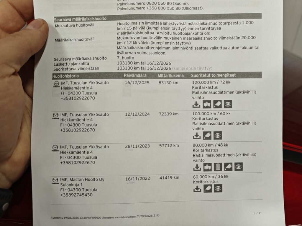 - Viimeisin huolto tehty 83 tkm 12/2025