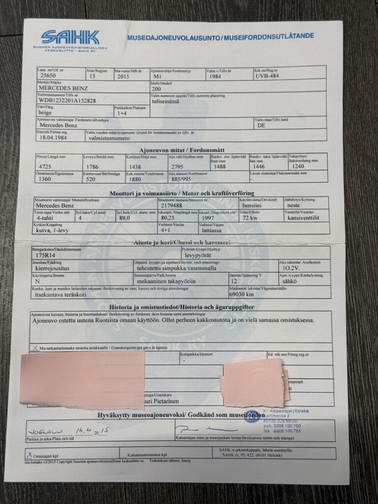 2,0 bensa (123) 4d Samassa perheessä uudesta asti! Museorekisteröity 2015.