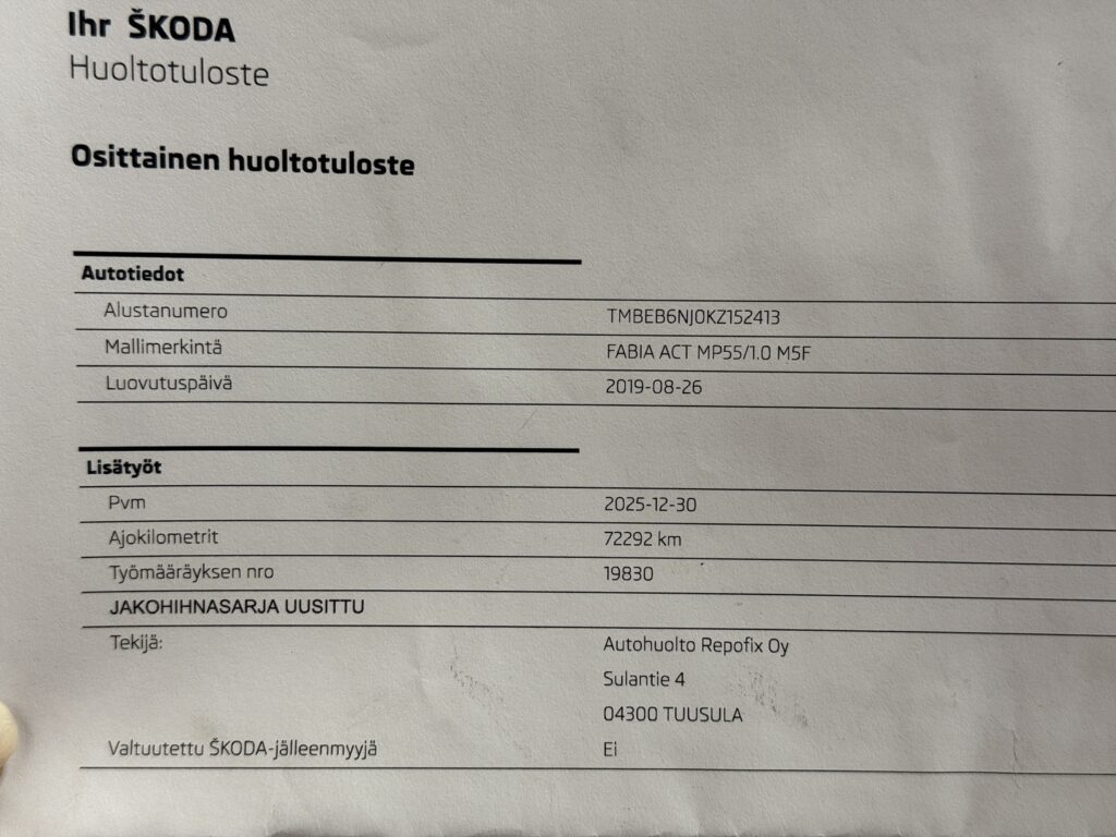 - Jakohihna vaihdettu 72 tkm 12/2025