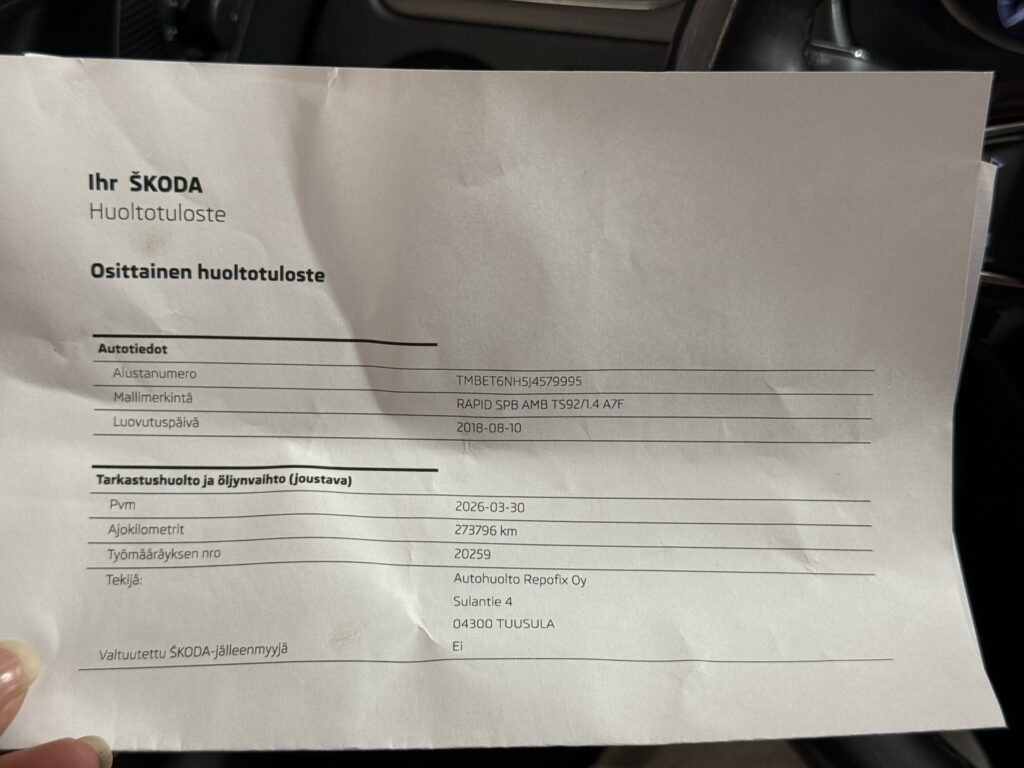 - Viimeisin huolto tehty 3/2026