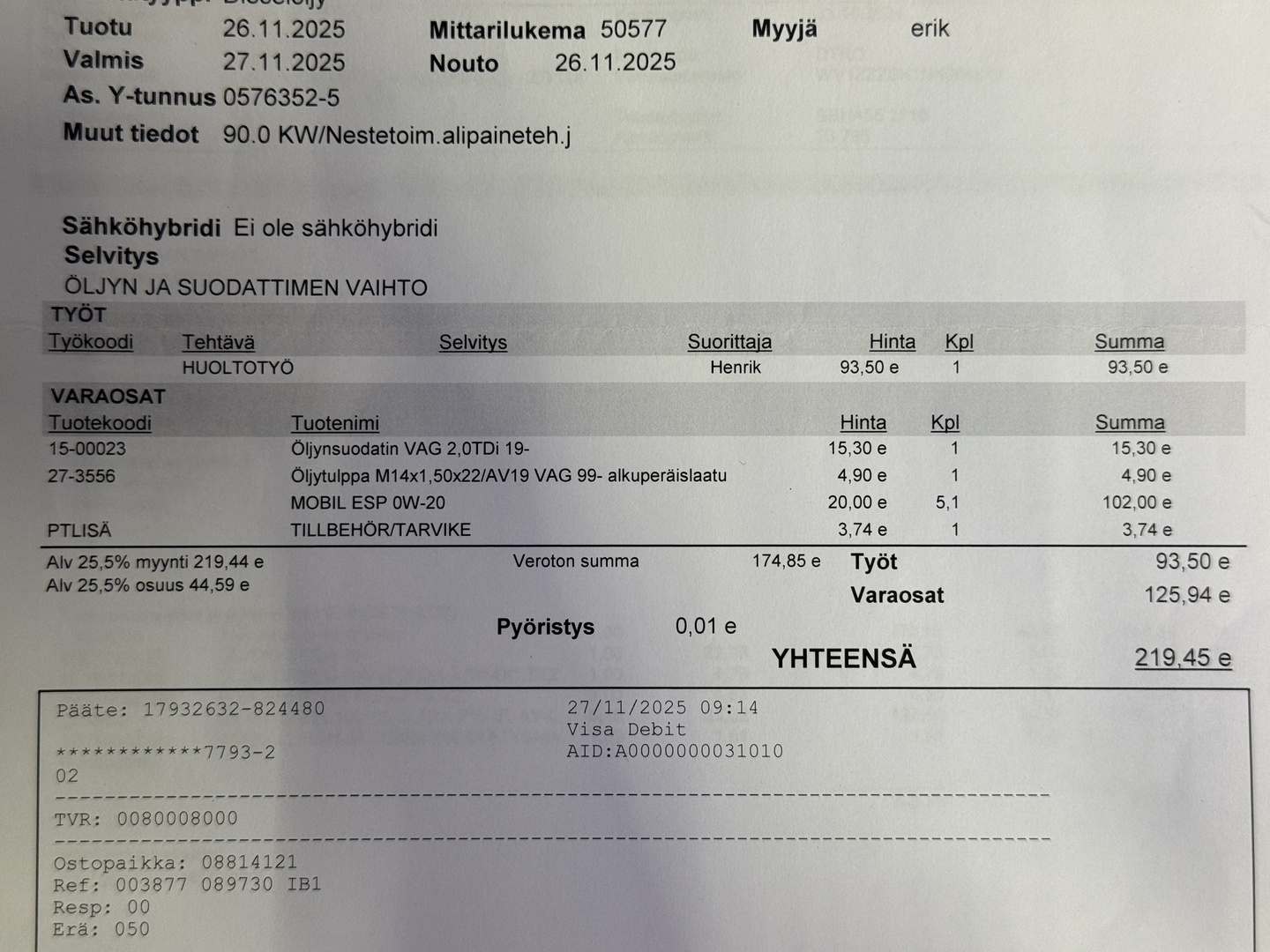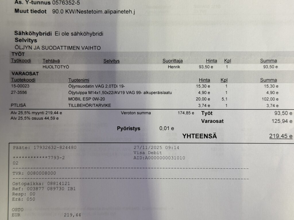 - Viimeisin huolto tehty 50 tkm 11/2025