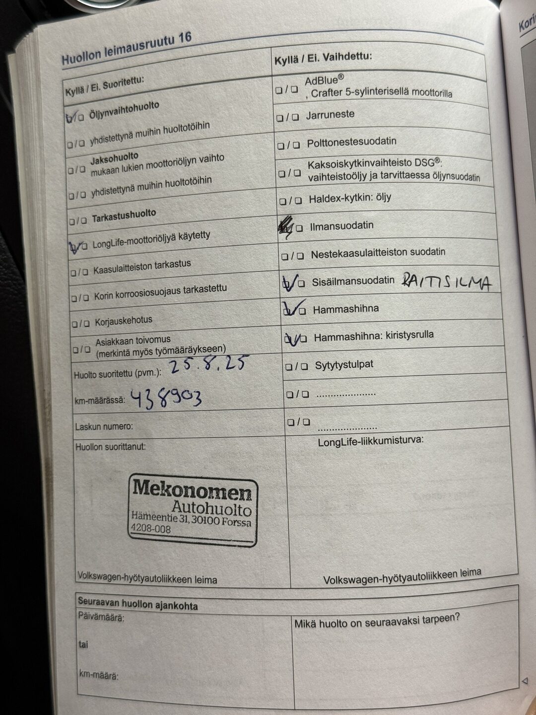 - Viimeisin huolto tehty 08/2025
