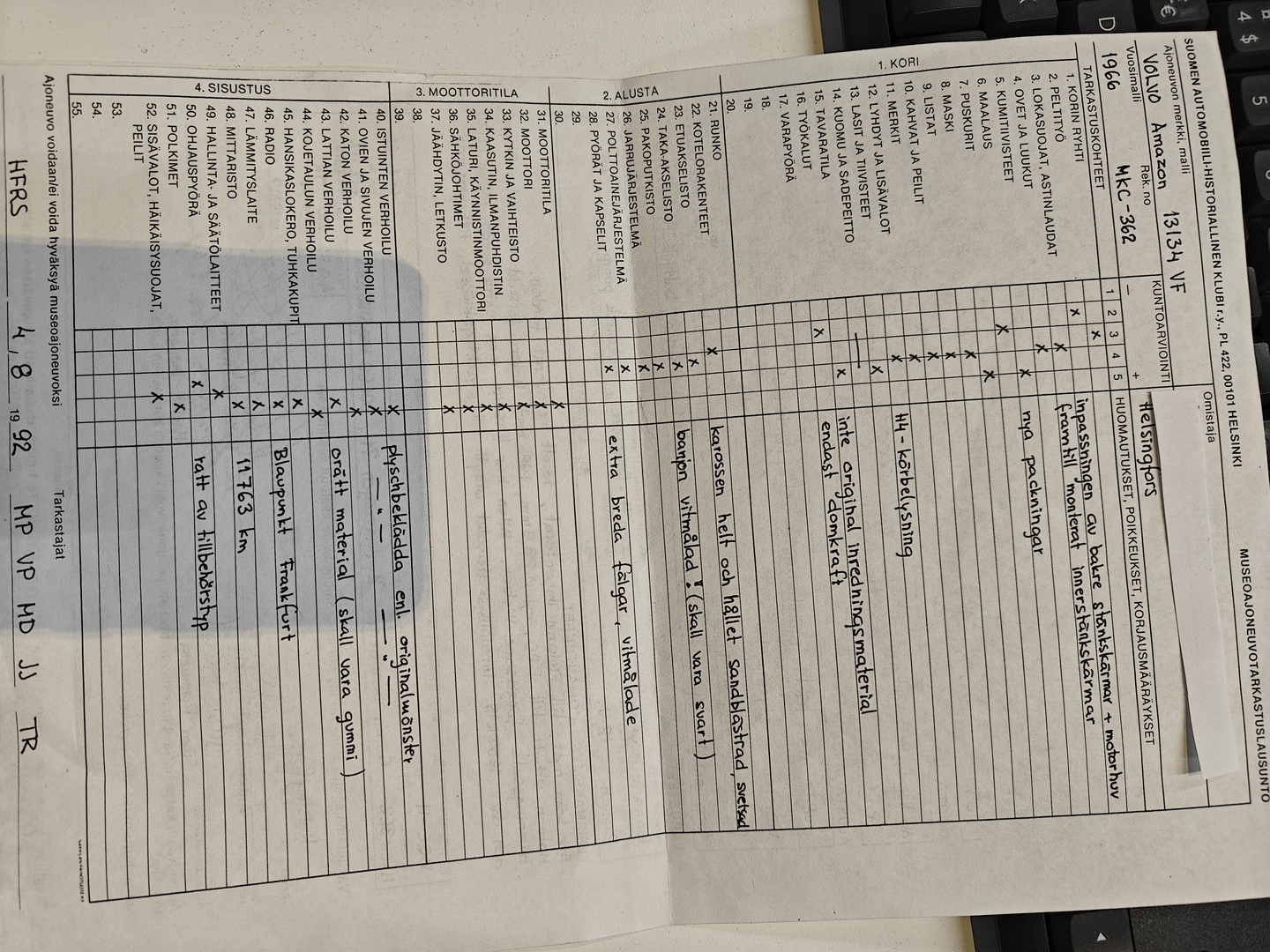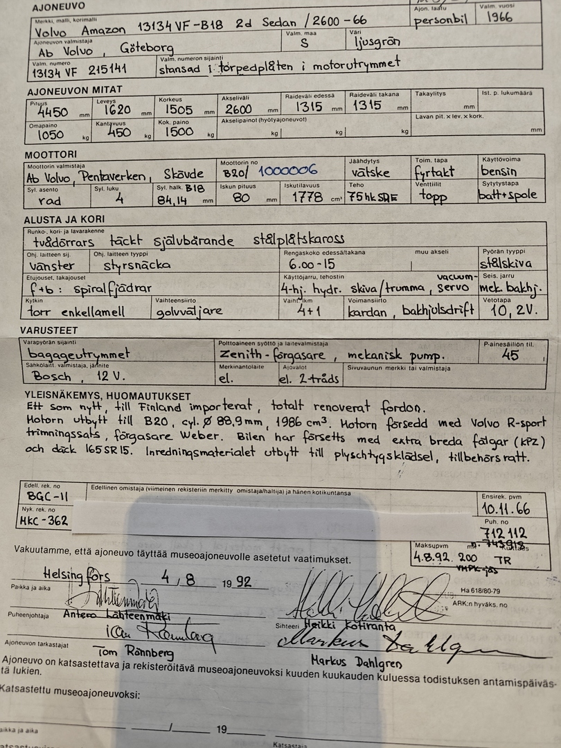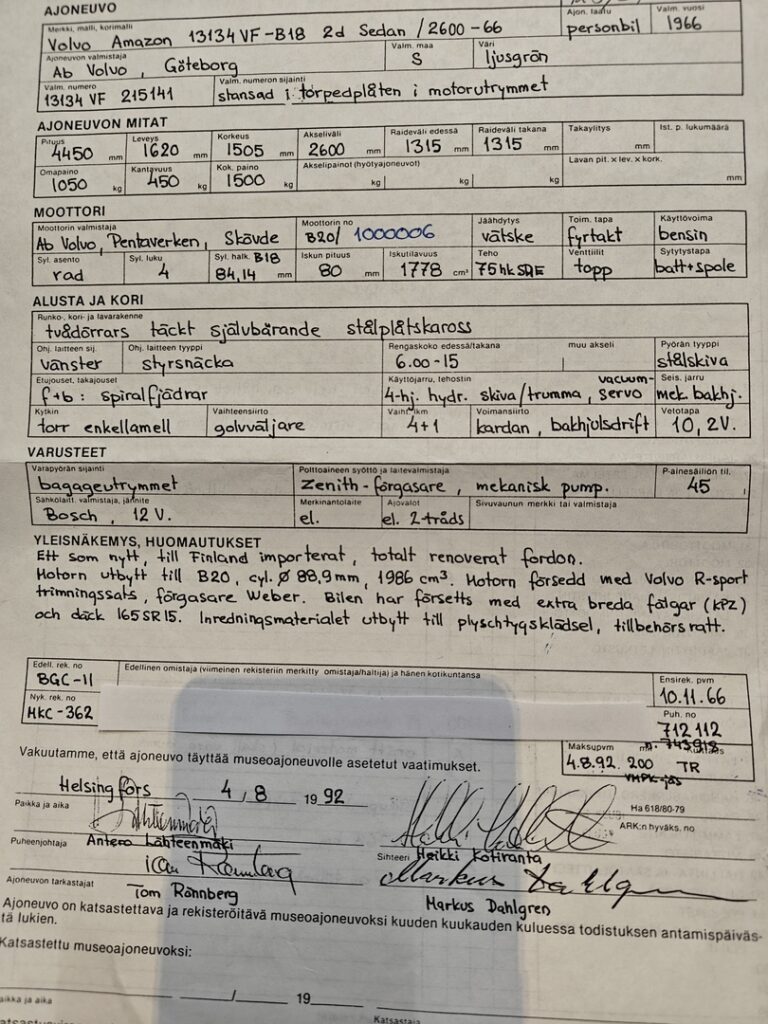 - Auto on museorekisterissä (4.8.1992) ja entiöity Volvon alkuperäisillä osilla