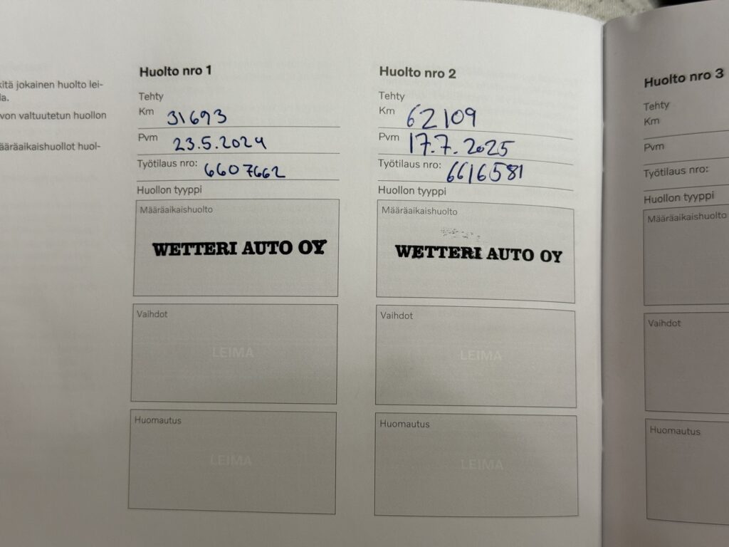 - Viimeisin huolto tehty 62tkm 7/2025 tkm Huoltoväli 30tkm / 2 V