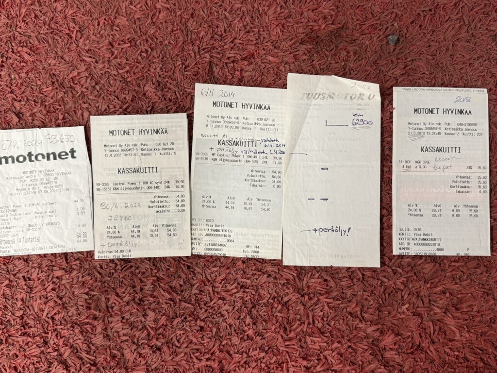 - Huoltohistoria, alussa huollettu liikkeessä josta leimat huoltokirjassa sen jälkeen itse huollettu, tarvikkeista kuitit joihin merkattu kilometrit ja päivänmäärät ylös.
